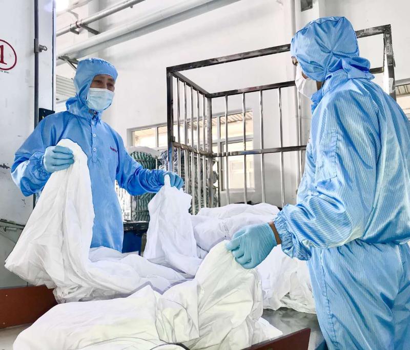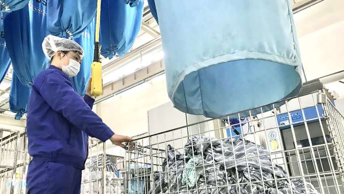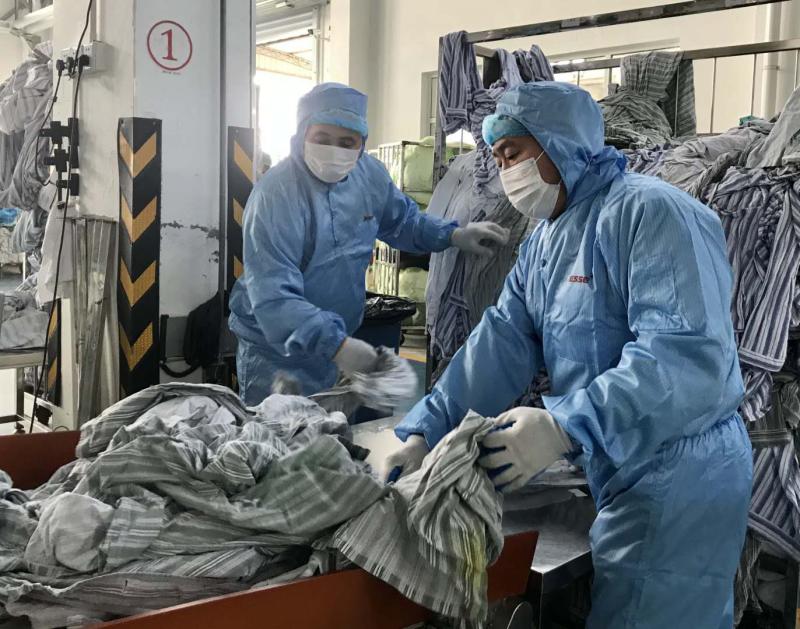 據他介紹,一方面,一般普通的臟污織物所經歷的消毒包含洗滌過程中的化學消毒和濕熱消毒,以及干燥過程中的干熱消毒,通過利用隔離式洗衣機洗滌,幾輪化學加物理消毒下來,可以保障織物的清潔衛生程度。對于重度污染的織物,甚至是感染性織物,消毒方式就更加嚴格了,無論從消毒劑的用量上,還是洗滌烘干的溫度上,都作了嚴的把控,以確保消毒質量。